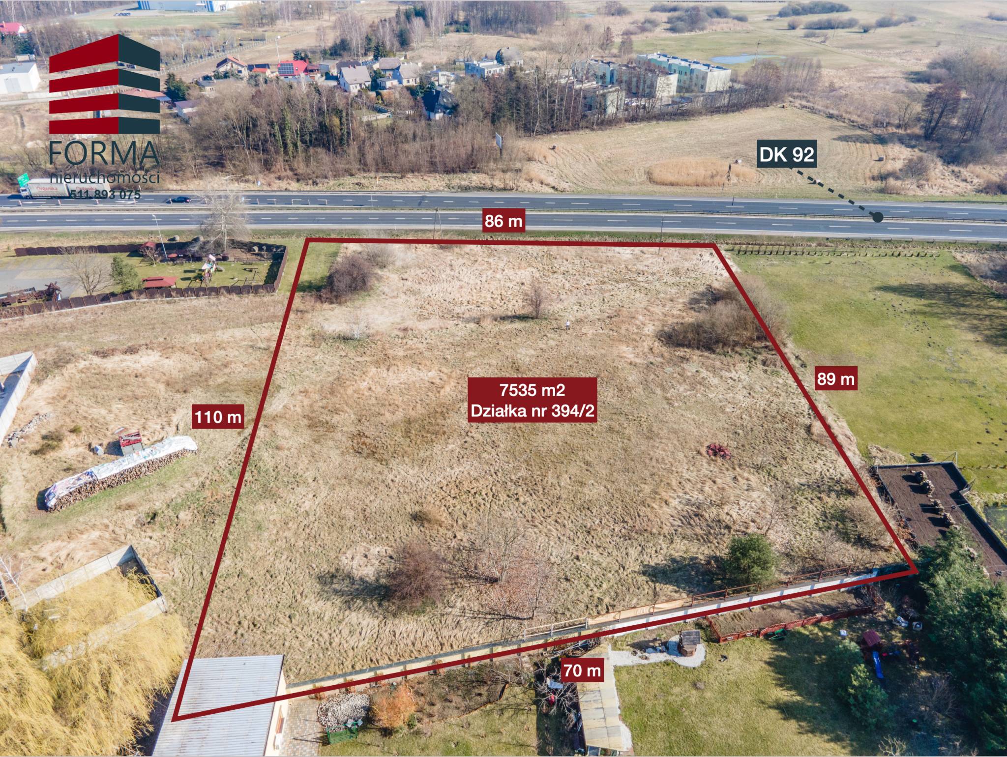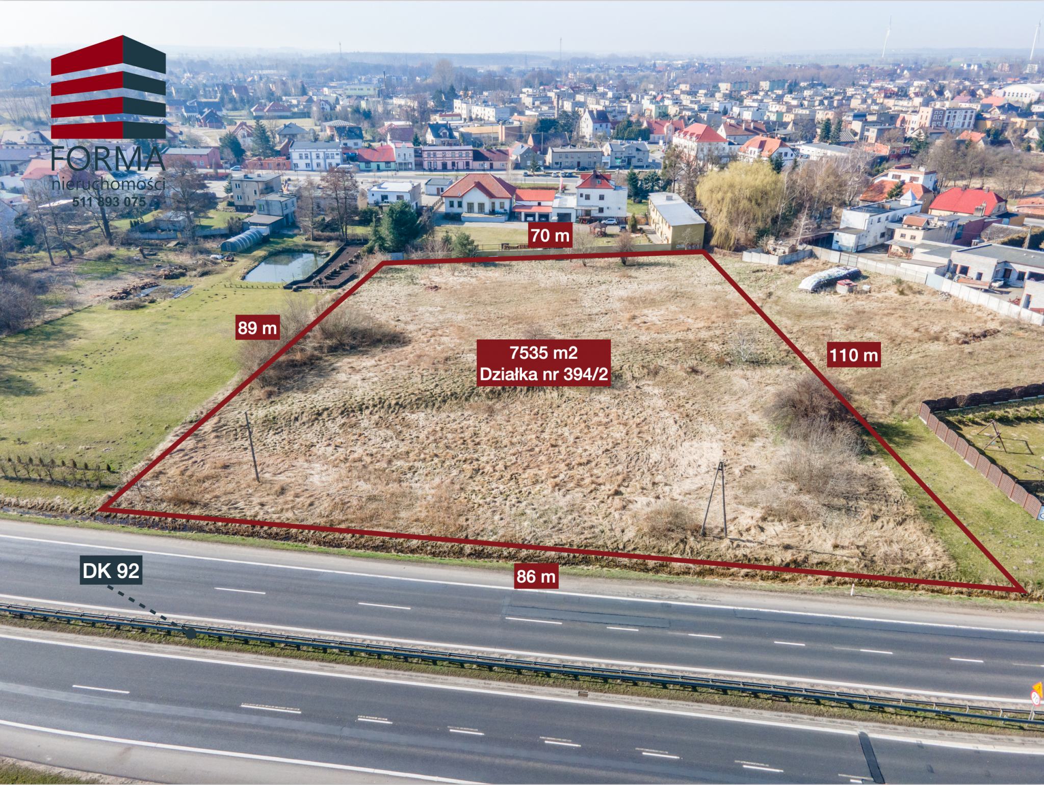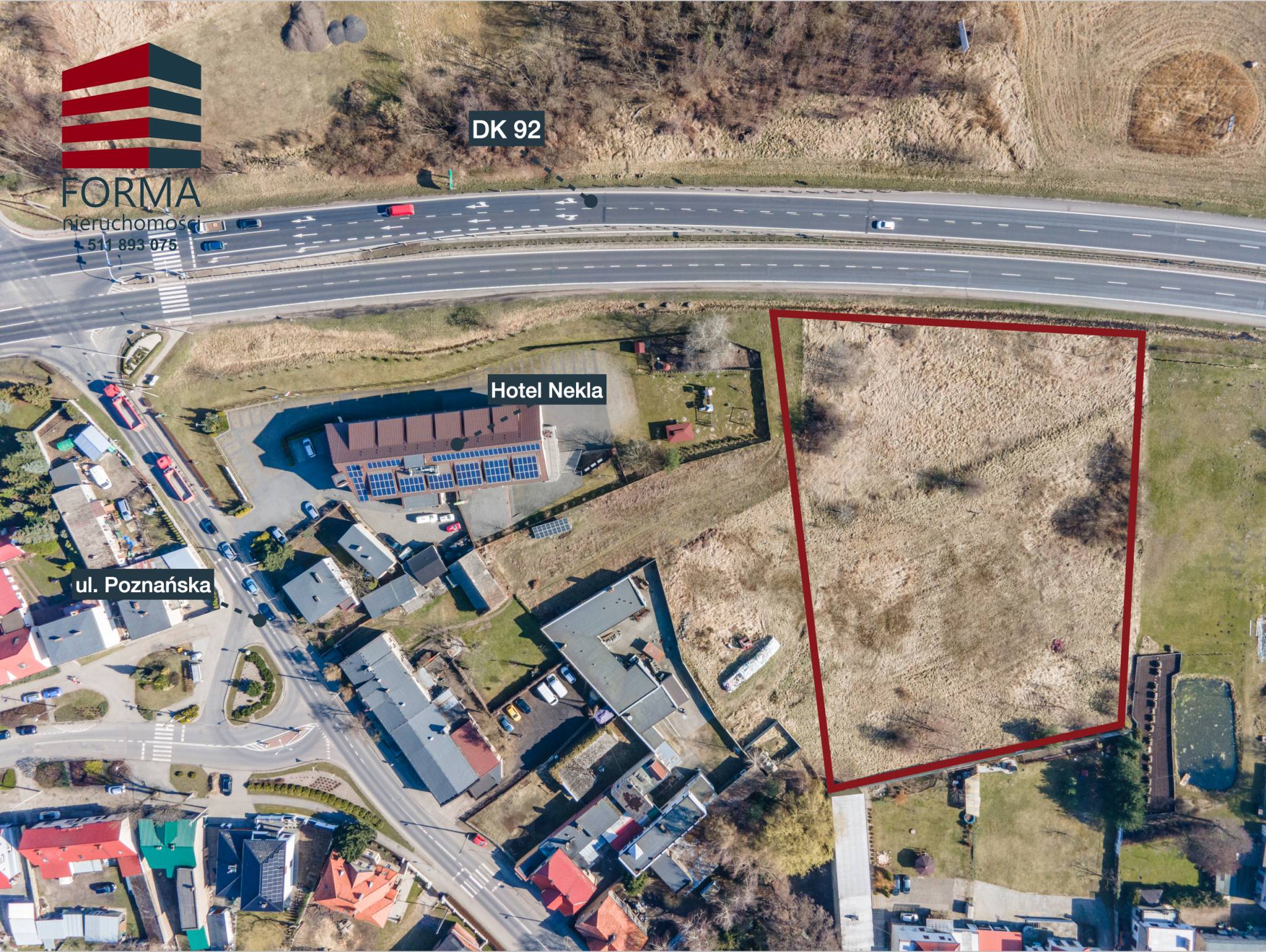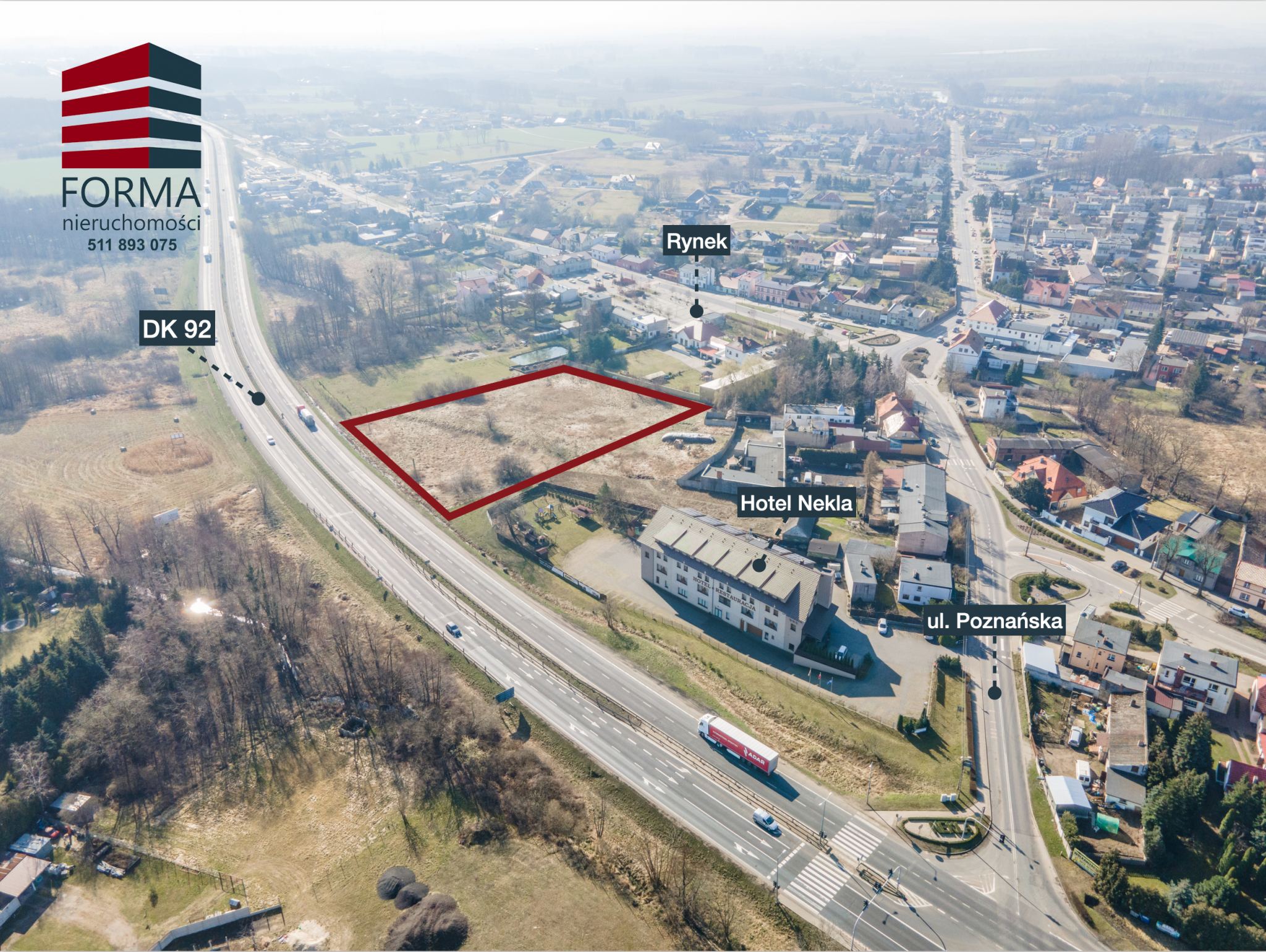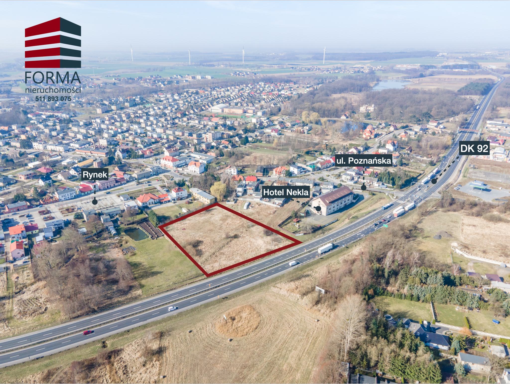 Polecam ofertę działki o pow. 7535 m2 ( działka nr 394/2 ) znajdującej się w Nekli, Powiat Wrzesiński, przy drodze Krajowej nr 92. niedaleko Hotelu Nekla.