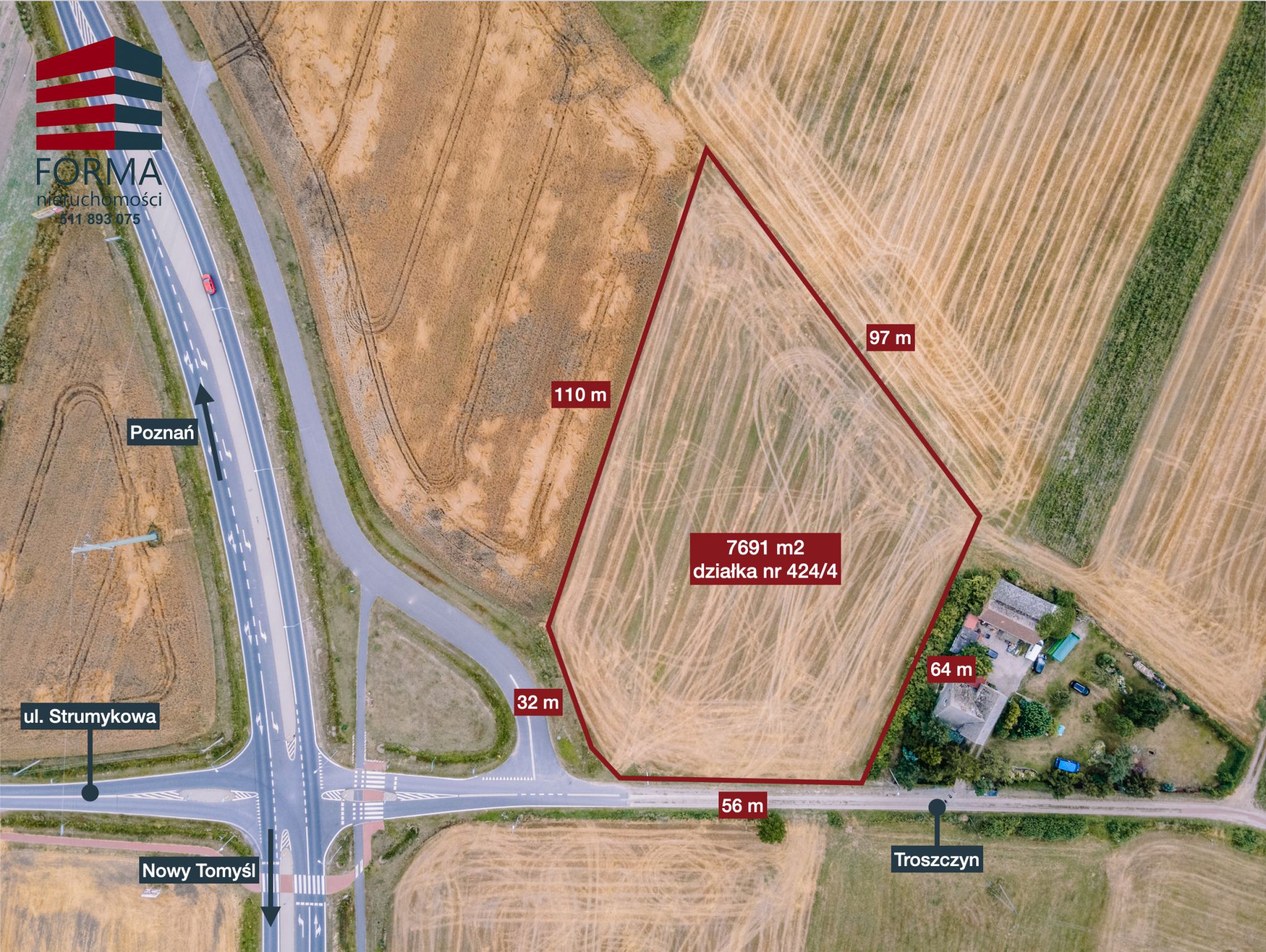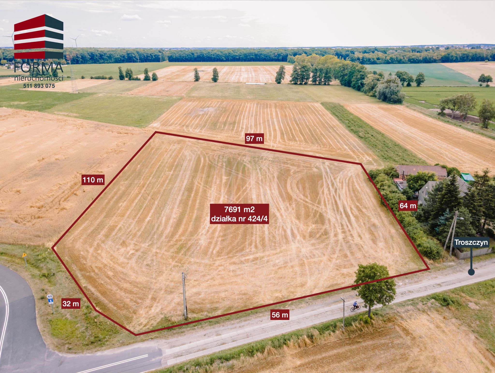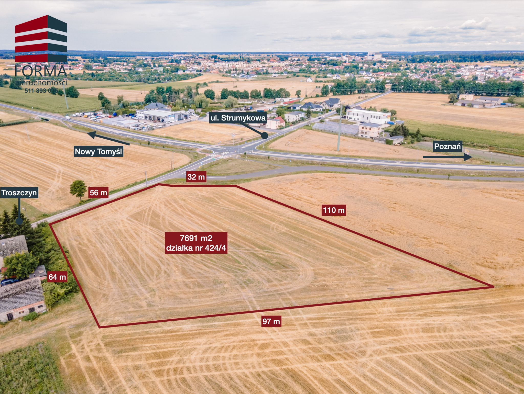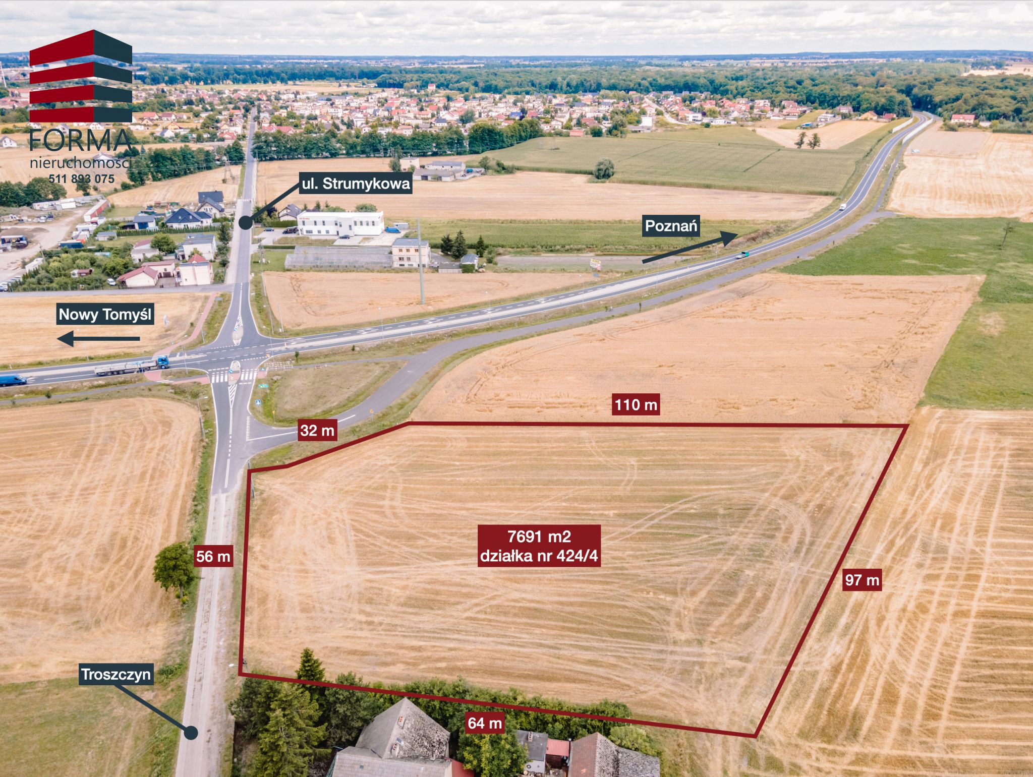 Polecam ofertę działki przemysłowej o pow. 7691 m2 w miejscowości Troszczyn, Gmina Opalenica, powiat Nowy Tomyśl przy obwodnicy Opalenicy.