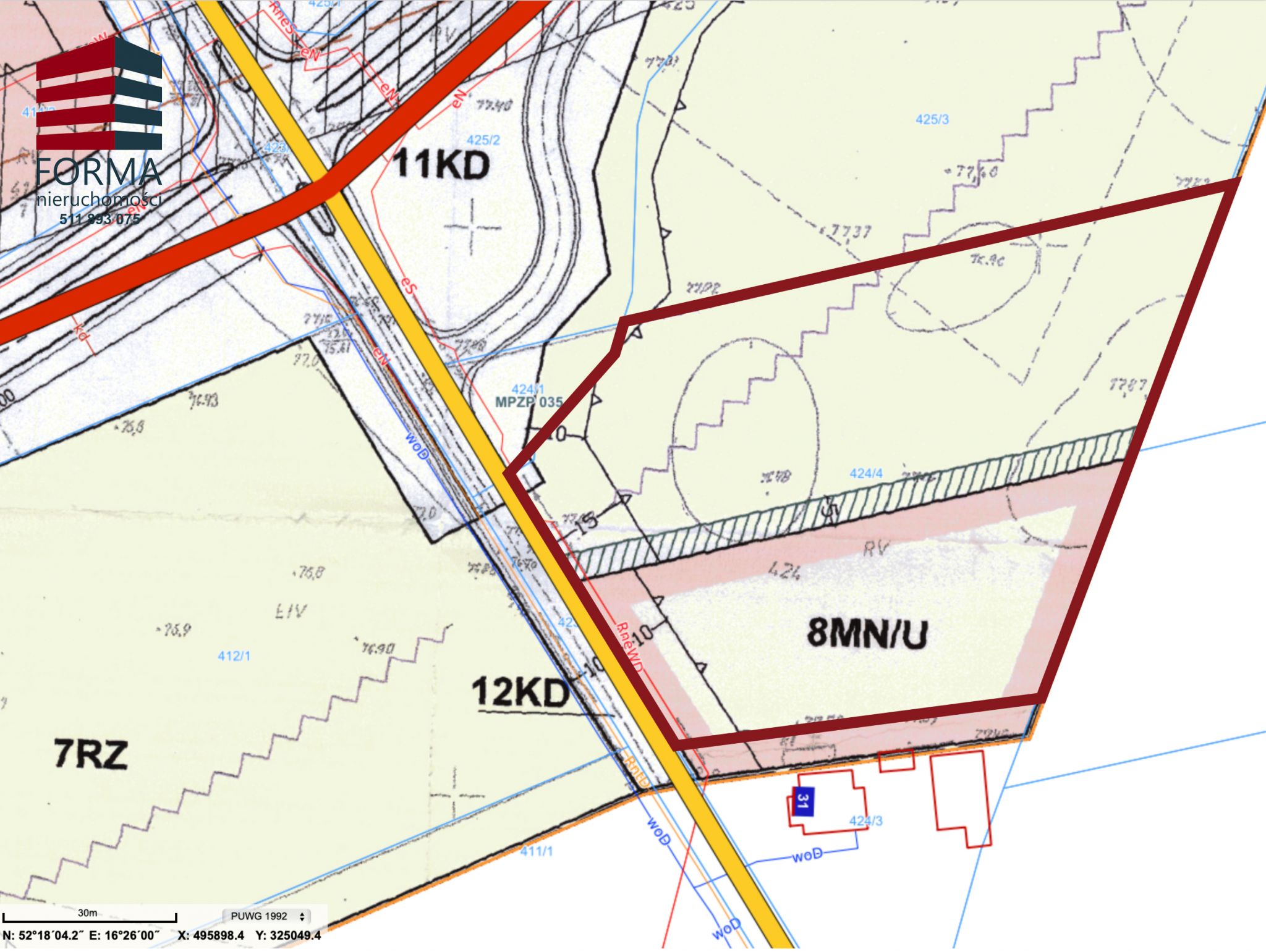 Działka nr 424/4 znajduję się na terenach 6P/U i 8MN/U ( klasa RV i RVI )