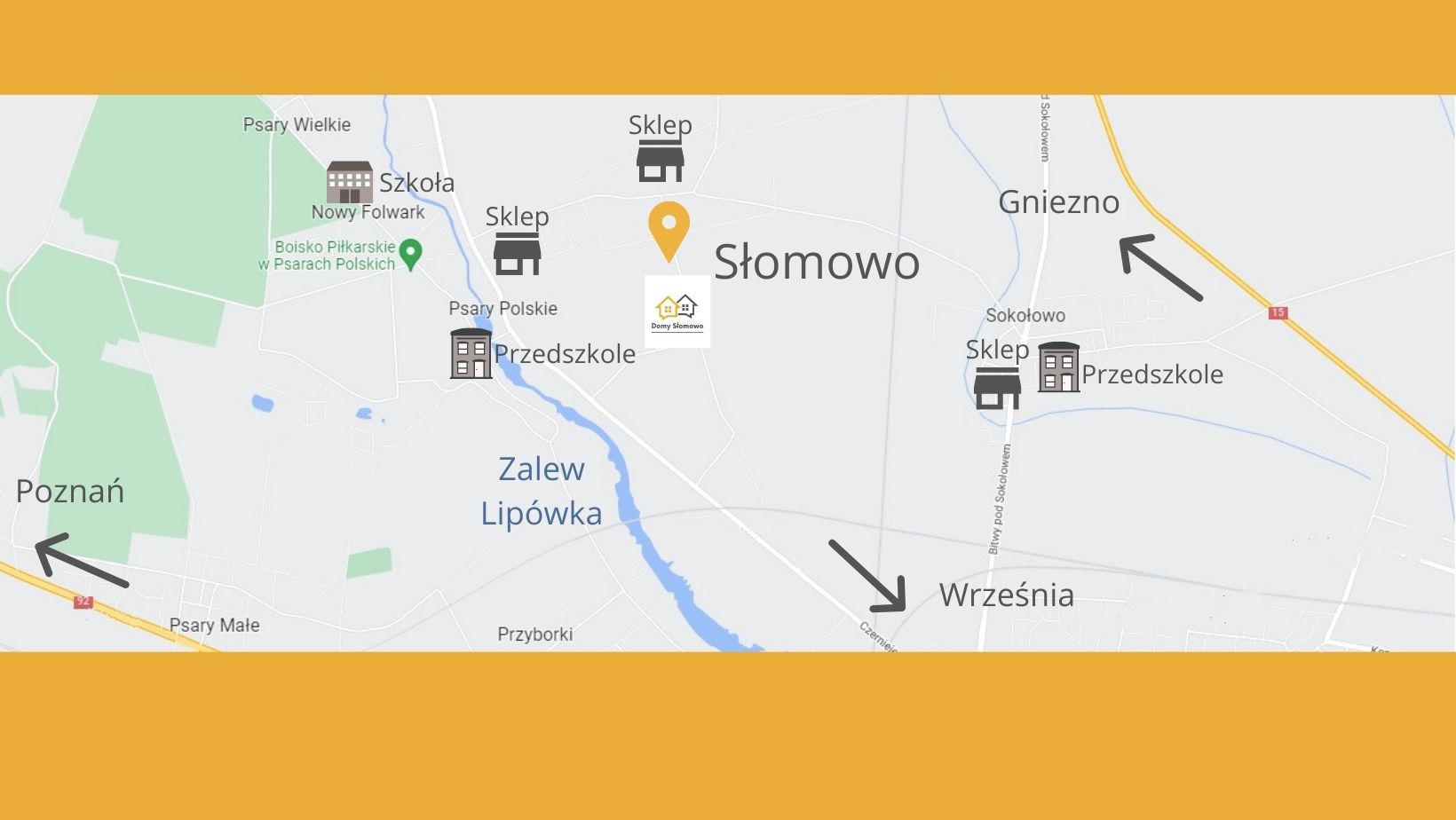 Domy na sprzedaż położone są Słomowie ‘’na wysokości Słomowo 126’’ przy asfaltowej drodze gminnej, w sąsiedztwie niskiej zabudowy jednorodzinnej, co zapewnia komfortową przestrzeń do życia i wygodny dojazd do Wrześni, Gniezna i Poznania.