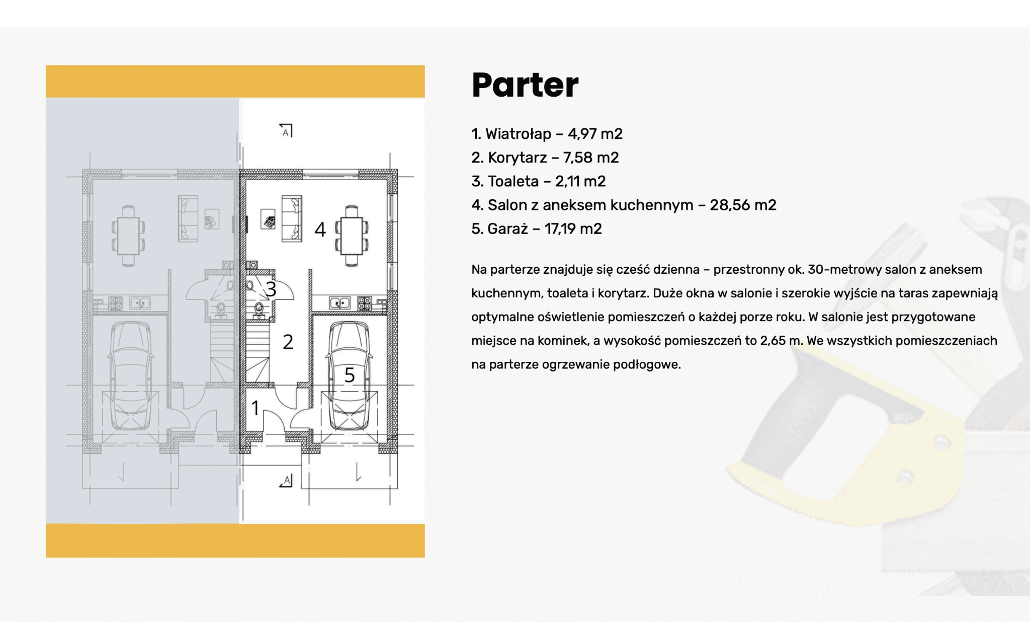 Na parterze znajduje się cześć dzienna – przestronny ok. 30-metrowy salon z aneksem kuchennym, toaleta i korytarz. Duże okna w salonie i szerokie wyjście na taras zapewniają optymalne oświetlenie pomieszczeń o każdej porze roku. W salonie jest przygotowane miejsce na kominek, a wysokość pomieszczeń to 2,65 m. We wszystkich pomieszczeniach na parterze ogrzewanie podłogowe.