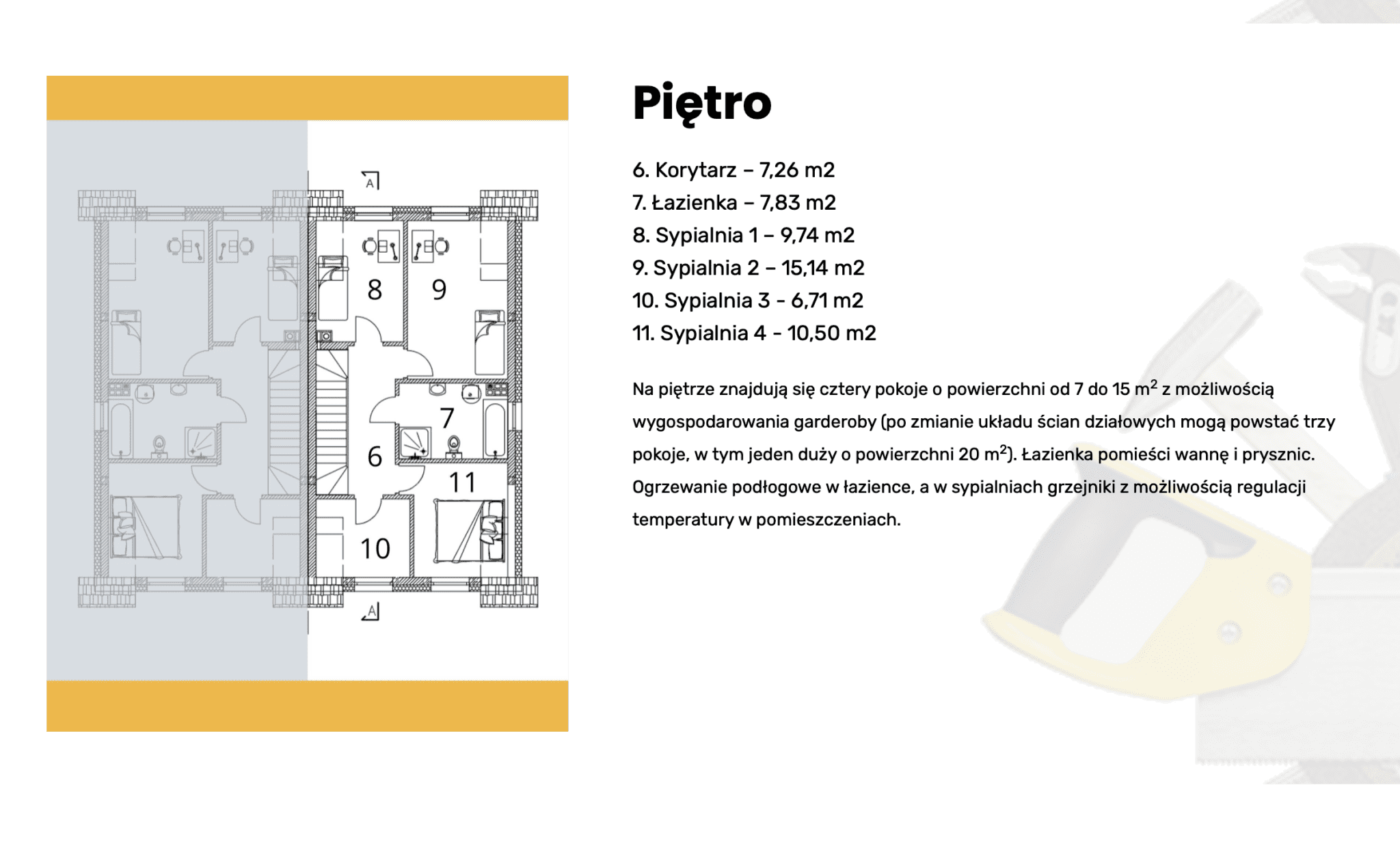 Na piętrze znajdują się cztery pokoje o powierzchni od 7 do 15 m2 z możliwością wygospodarowania garderoby (po zmianie układu ścian działowych mogą powstać trzy pokoje, w tym jeden duży o powierzchni 20 m2). Łazienka pomieści wannę i prysznic. Ogrzewanie podłogowe w łazience, a w sypialniach grzejniki z możliwością regulacji temperatury w pomieszczeniach.