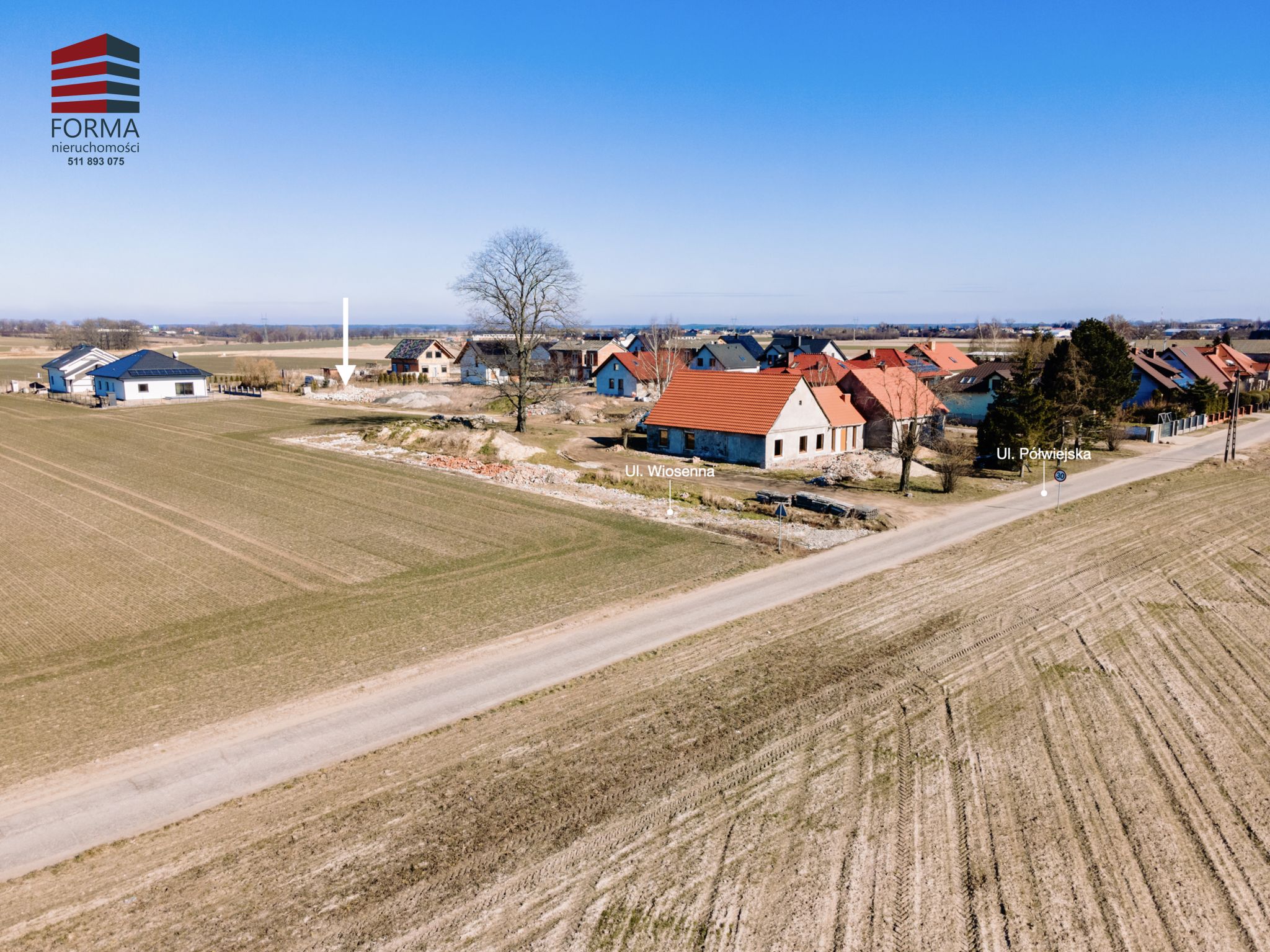 zjazd z ul. Półwiejskiej ( pełniącej funkcje drogi publicznej – gminnej ) poprzez drogę wewnętrzną ul Wiosenna działka prywatna nr 2/36 ( w cenie służebność przejazdu i przechodu)