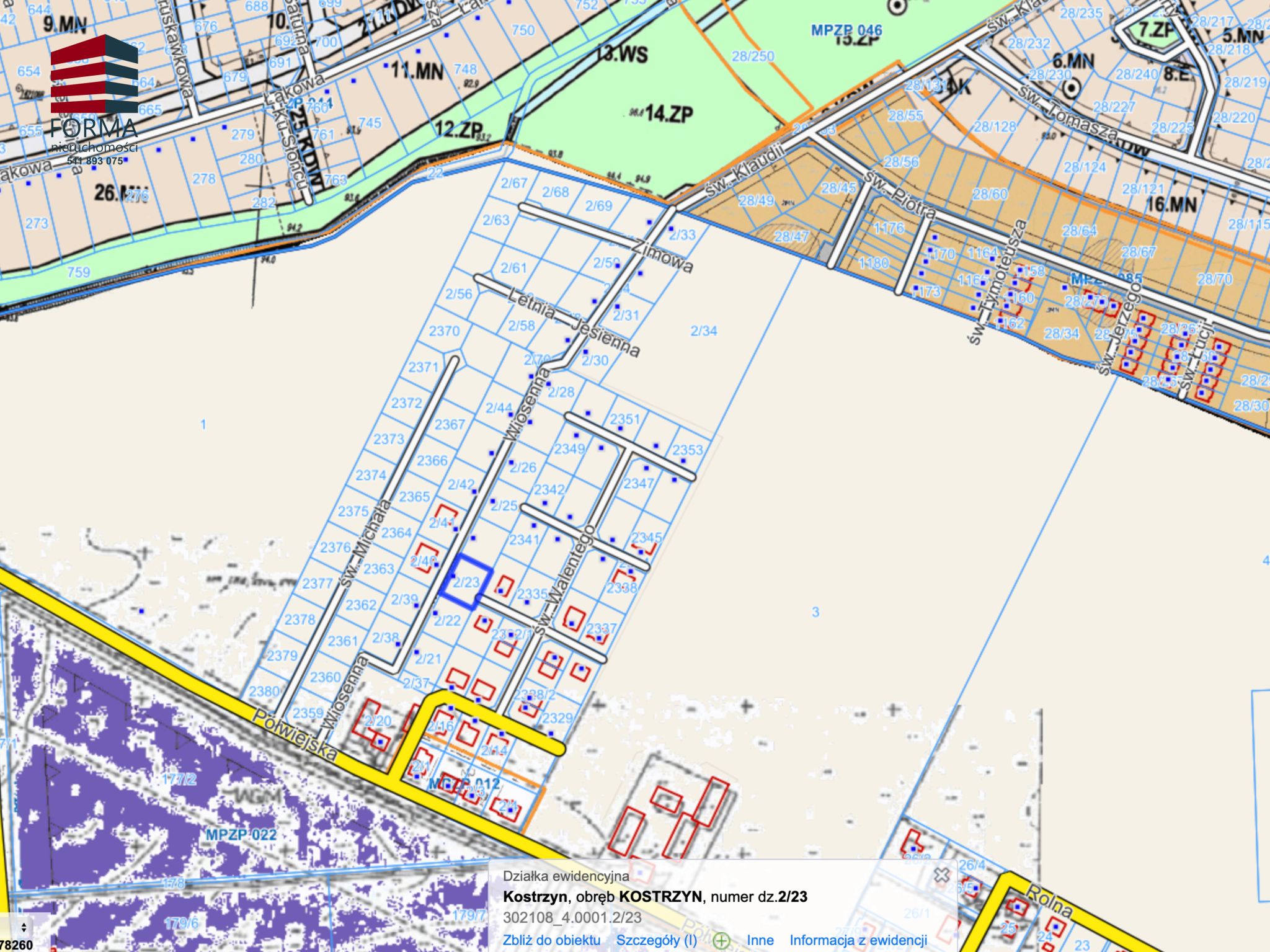 Działki położone są na terenie ZABUDOWY MIESZKANIOWEJ JEDNORODZINNEJ w studium uwarunkowań i kierunków zagospodarowania przestrzennego gminy Kostrzyn.