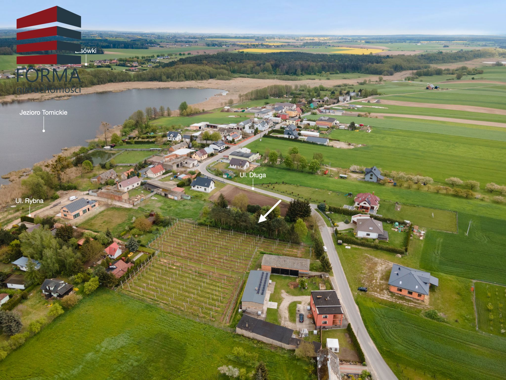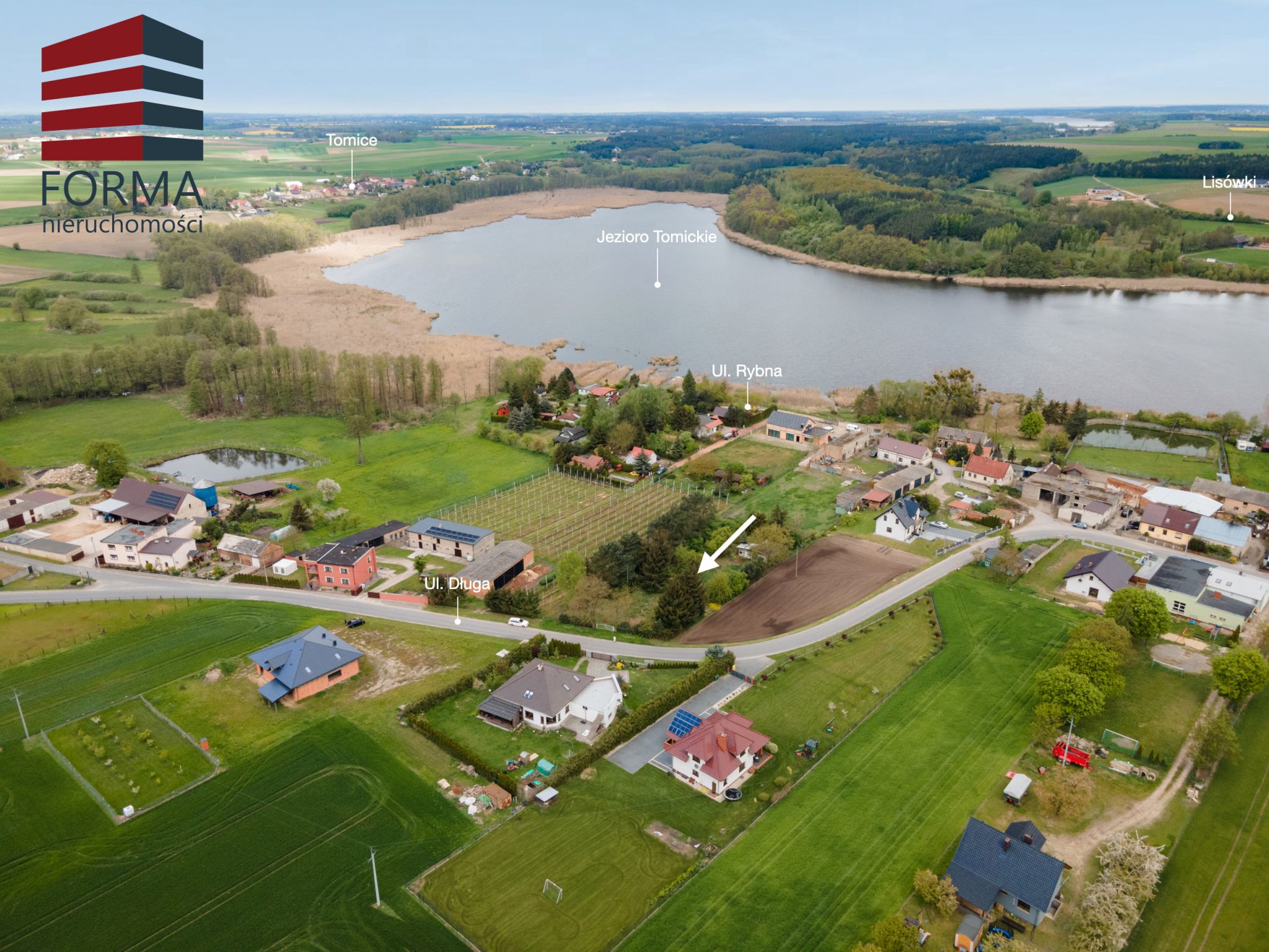 Działka Położona jest w pięknej i spokojnej miejscowości oraz graniczy bezpośrednio z drogą asfaltową. Doskonałe miejsce dla osób ceniących sobie cisze i spokój, ponieważ działka posiada widok na jezioro Tomickie, które znajduje się na terenie otuliny Wielkopolskiego Parku Narodowego.
