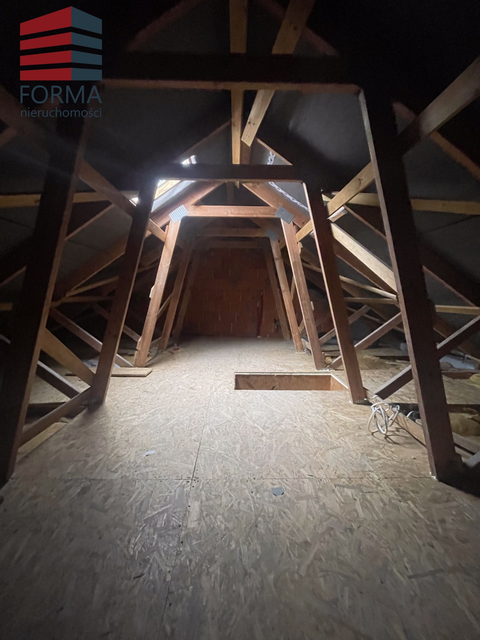 Na poddaszu znajduje się duży pokój z oknem dachowym