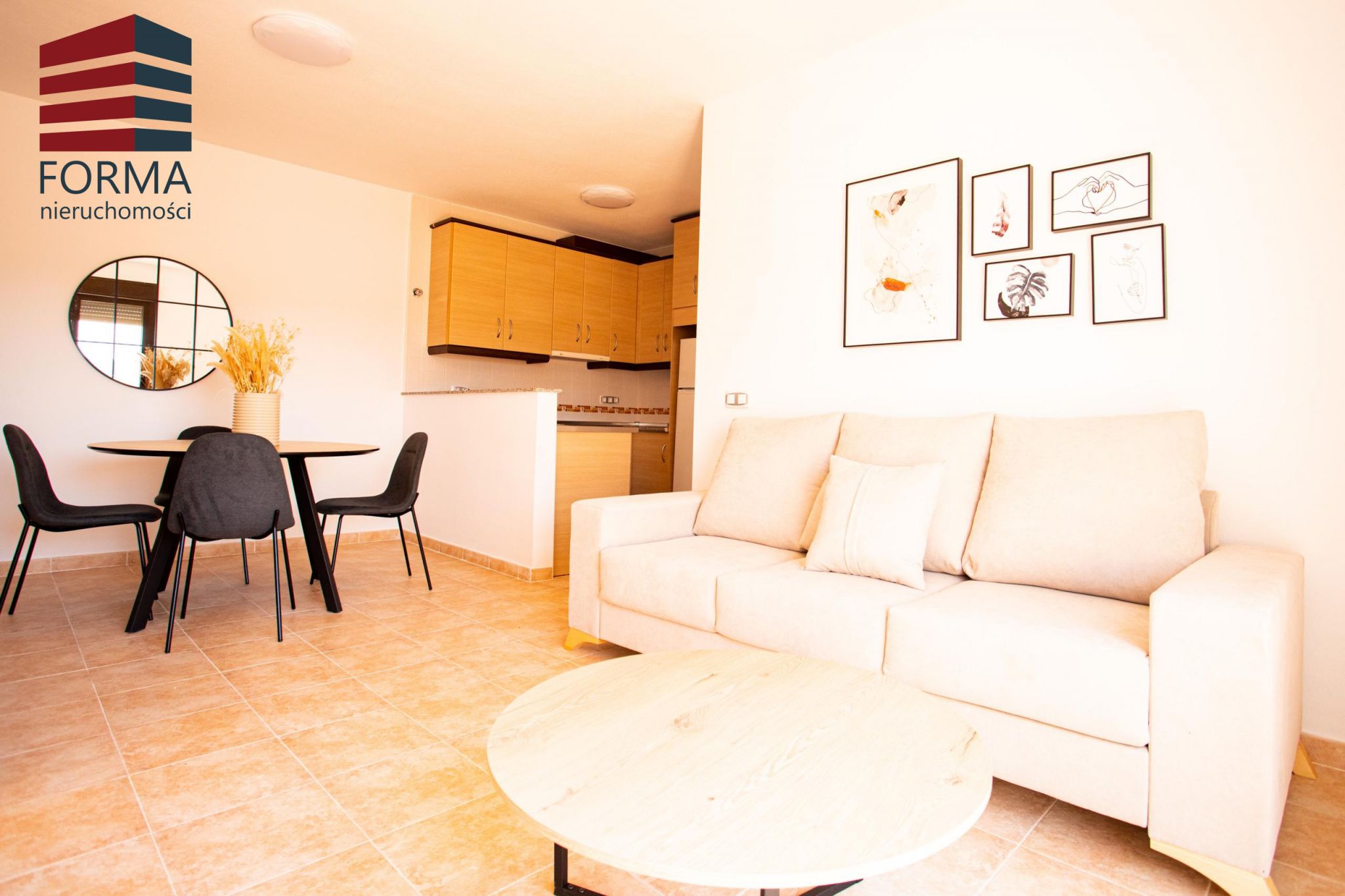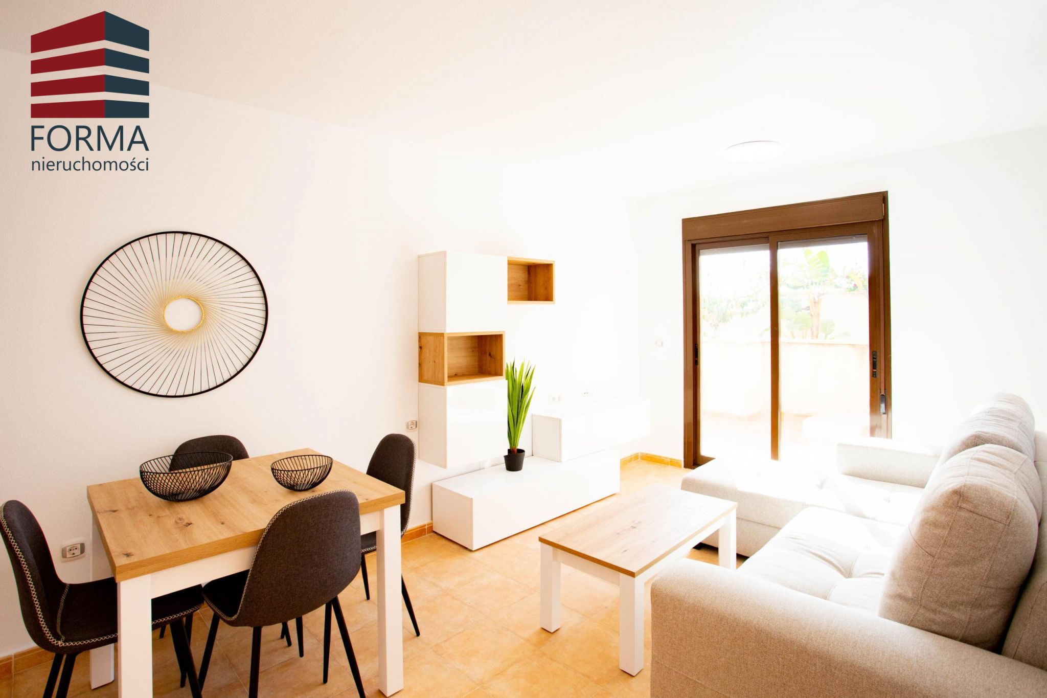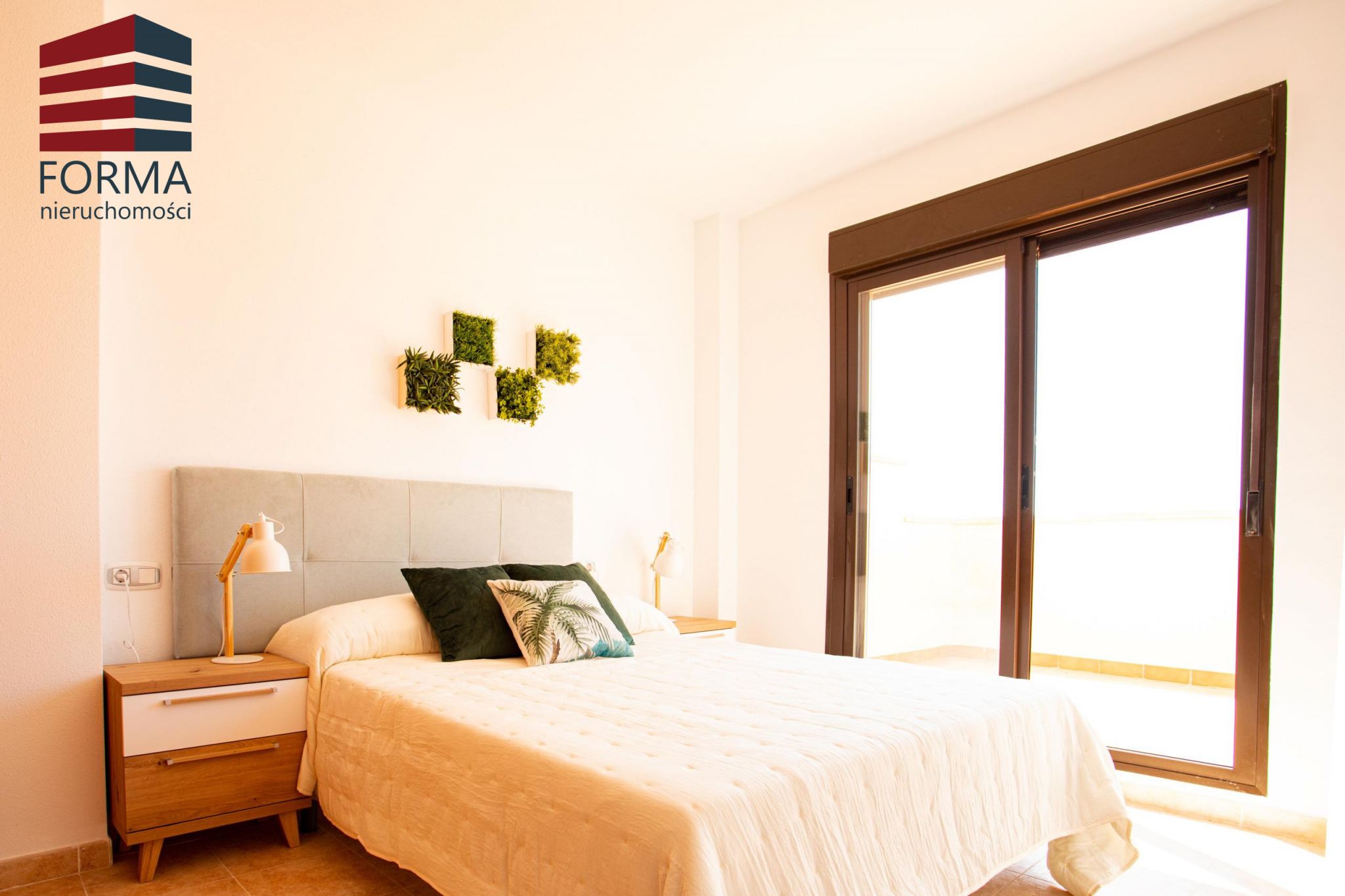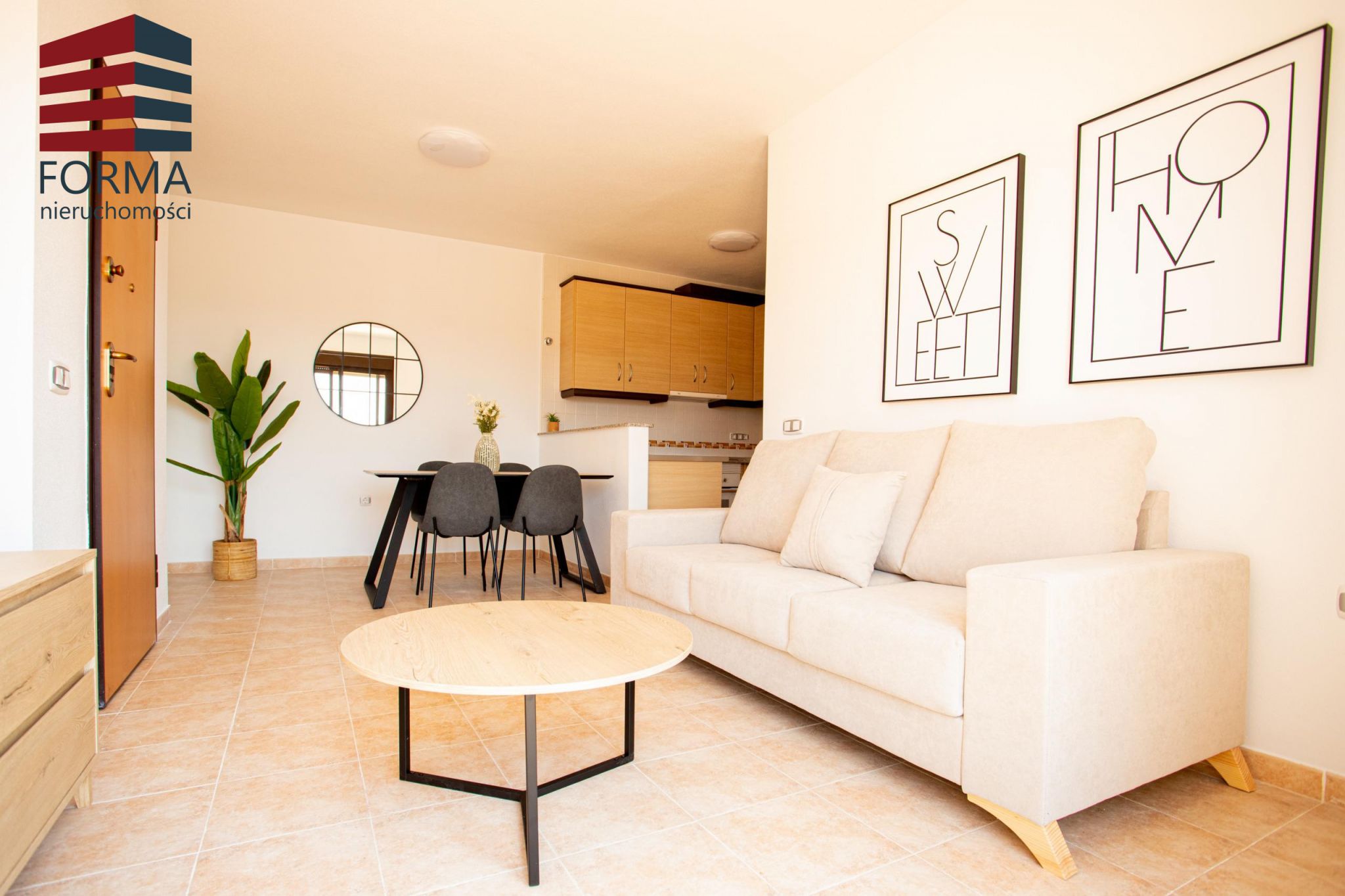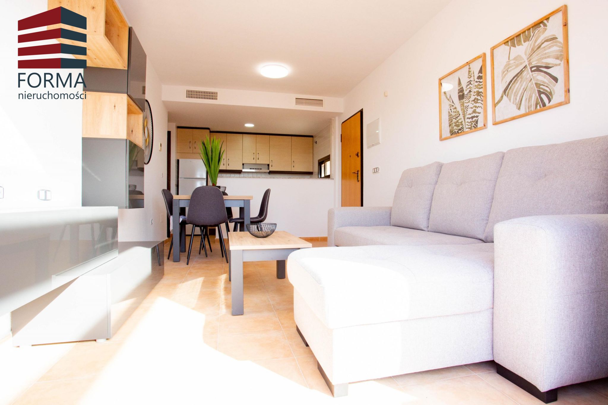 Dostępne apartamenty z 2 i z 3 sypialniami i 2 łazienkami. Wejście do mieszkania prowadzi do przestronnego salonu z jadalnią połączonego z otwartą kuchnią wyposażoną w wysokie i niskie szafki w melaminie drewnopodobnej oraz blatem w kamieniu. Kuchnia dostarczana wraz z całym sprzętem AGD.