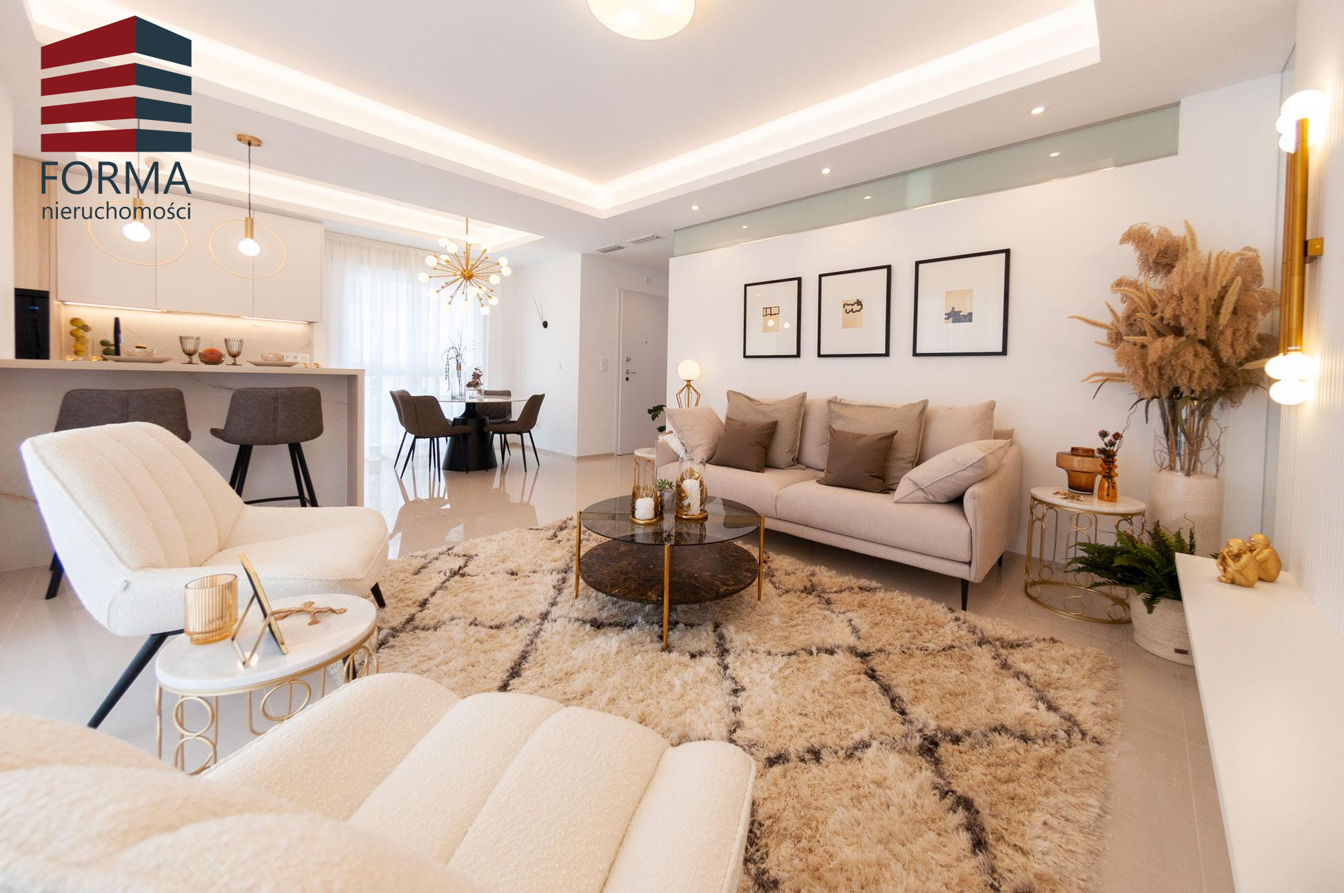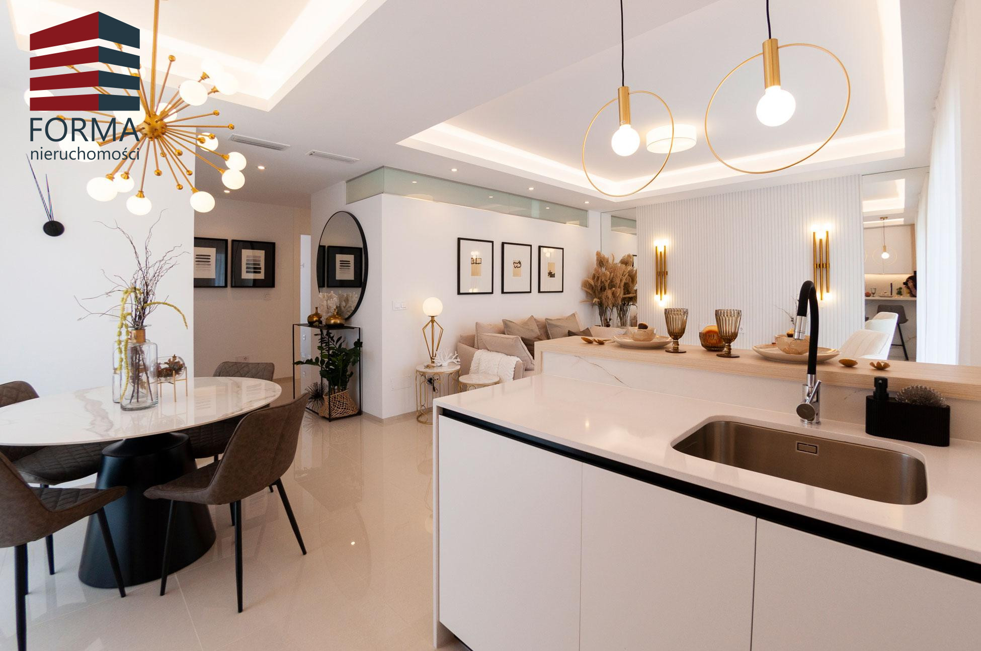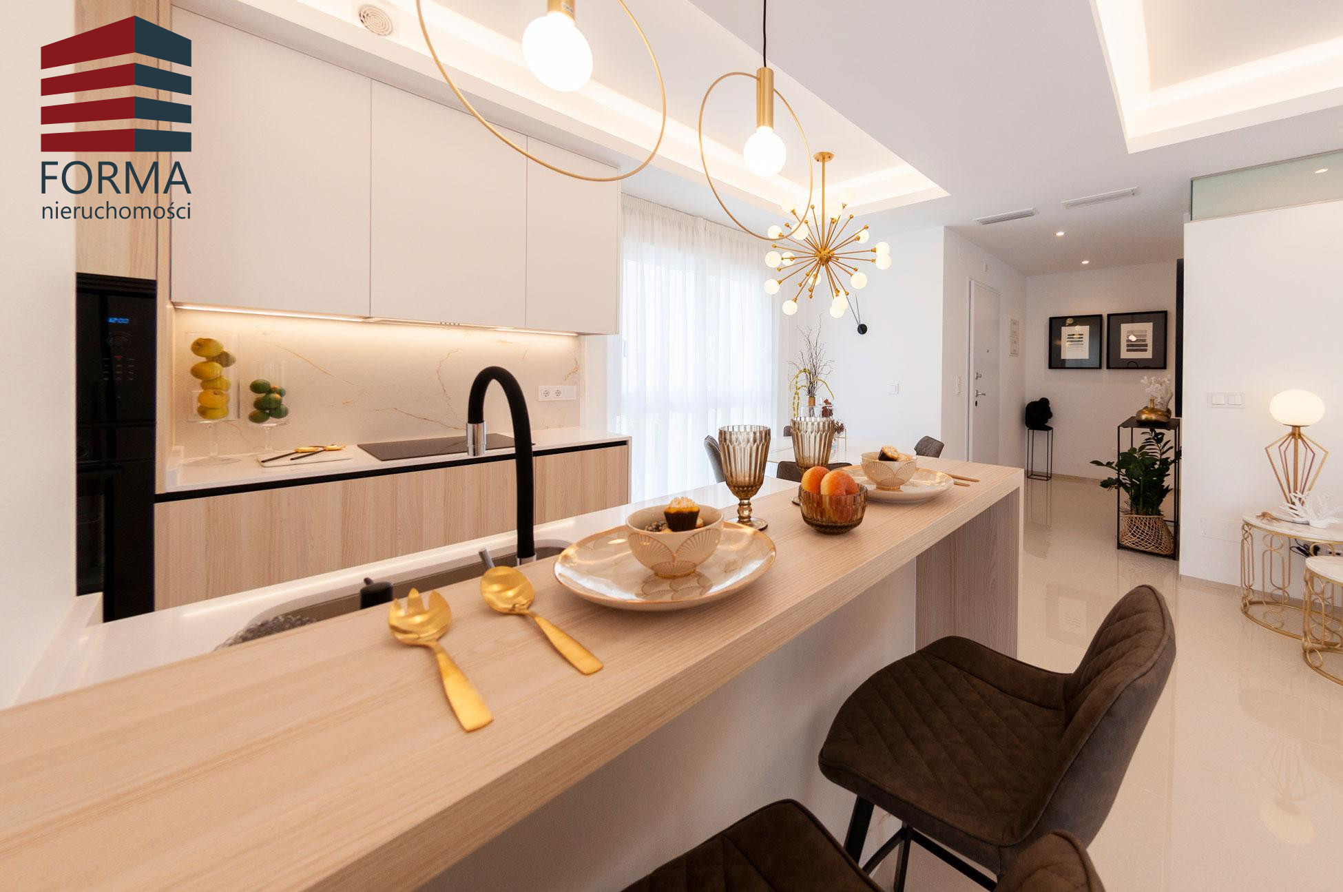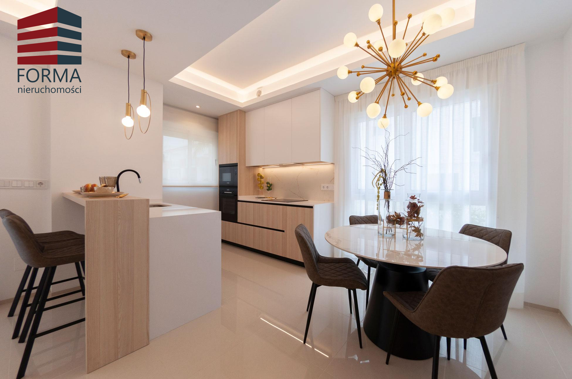 Posiada salon i jadalnię na otwartym planie z dużą ilością naturalnego światła dziennego , w pełni wyposażoną kuchnię z szafkami ściennymi i dolnymi oraz wbudowanym zlewem. Materiały są doskonałej jakości, a wystrój jest znakomity.