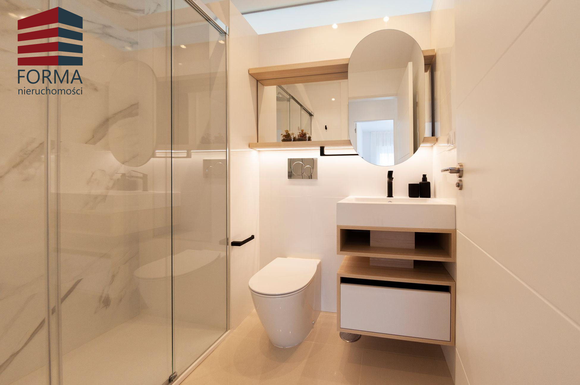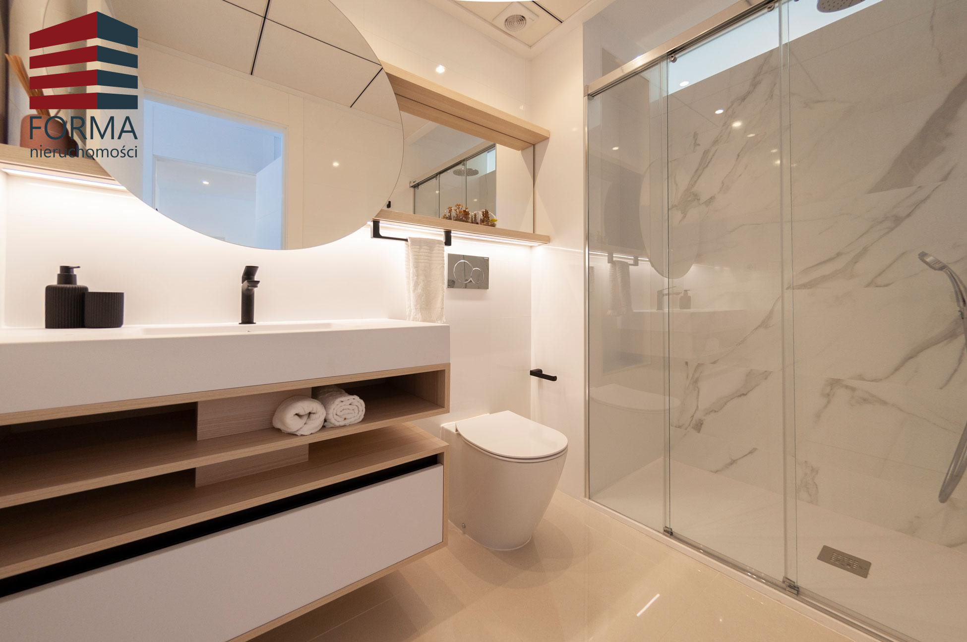 Łazienki są całkowicie wykończone i wyposażone w umywalkę, szafkę, lustro i kabinę prysznicową.