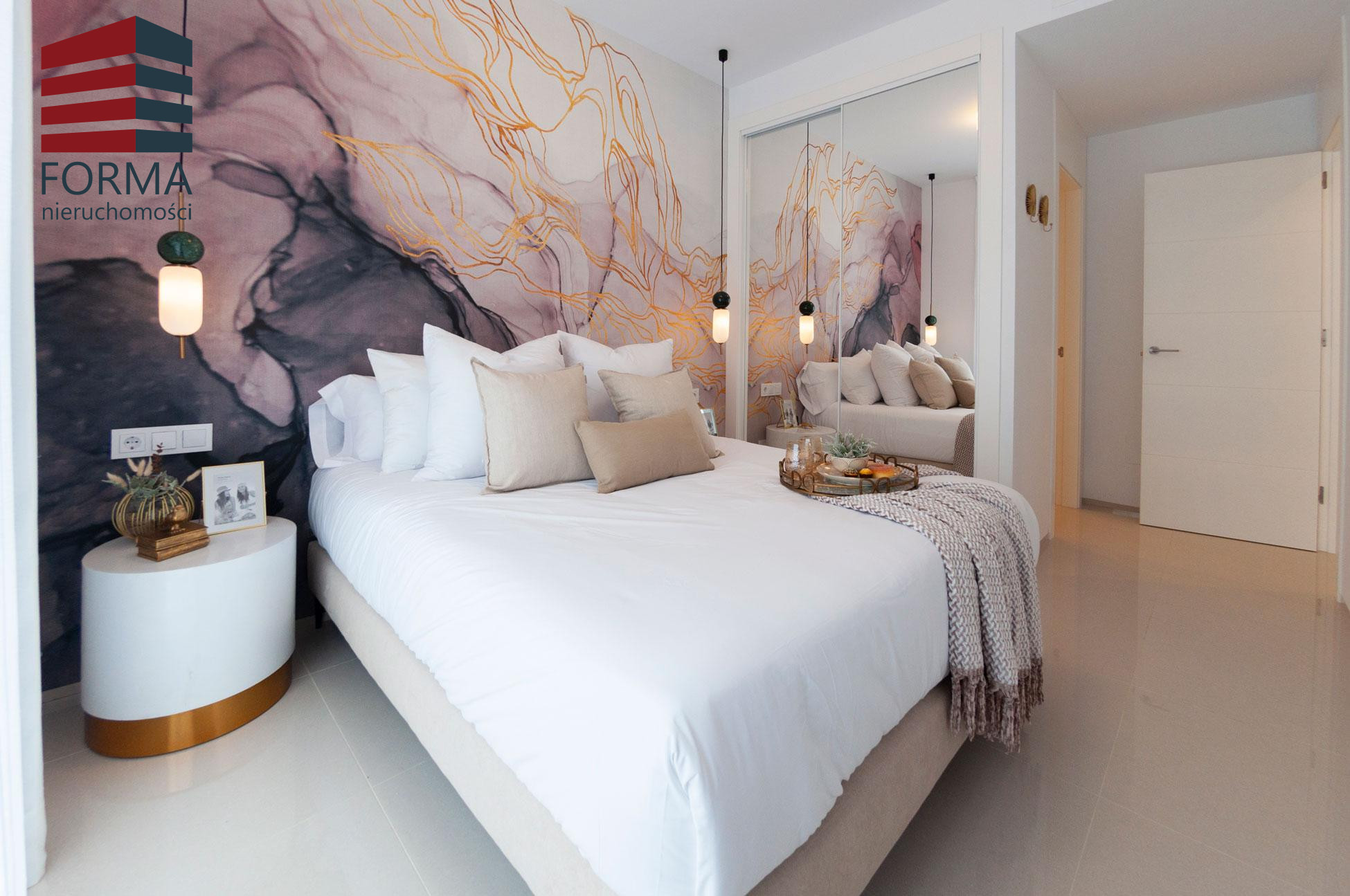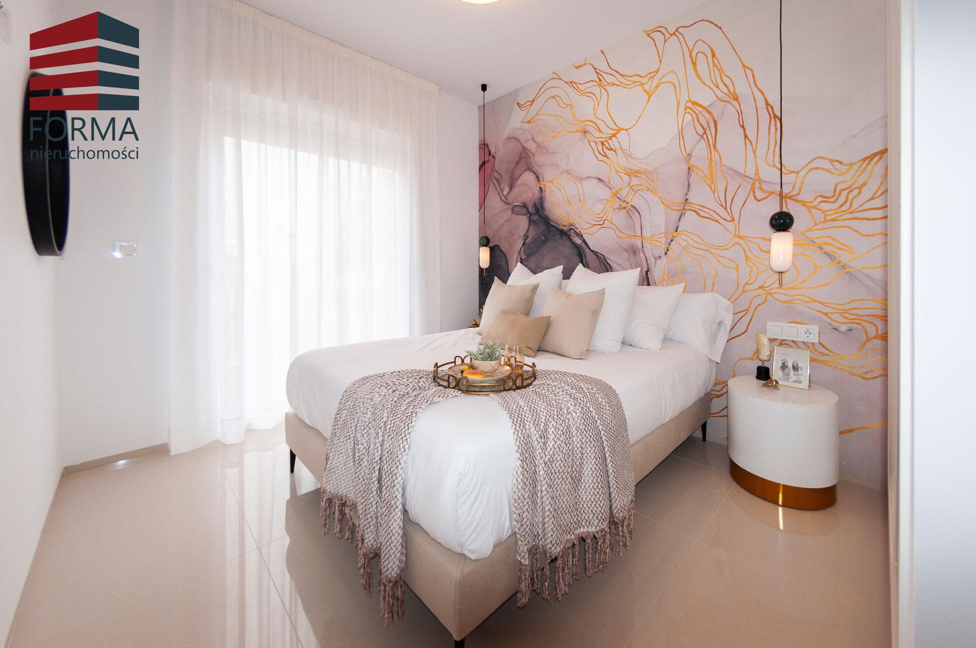 Sypialnie mają duże okna, które zapewniają mnóstwo światła i nowoczesne białe lakierowane szafy.